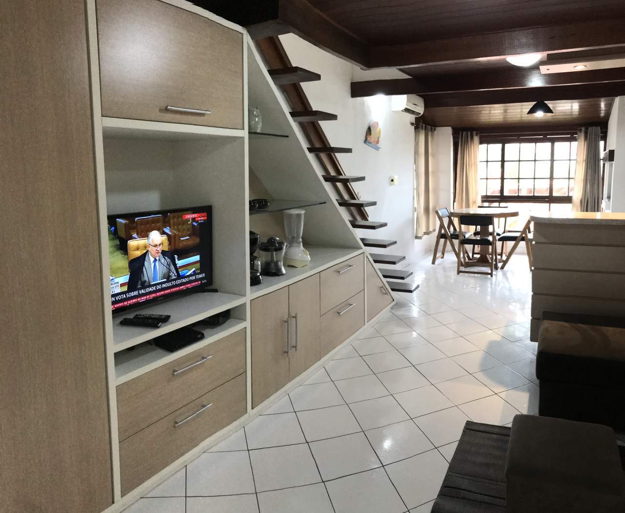 - Sala de estar/jantar com ar-condicionado split, tv e banheiro.